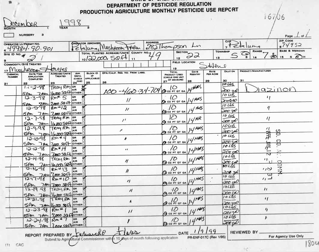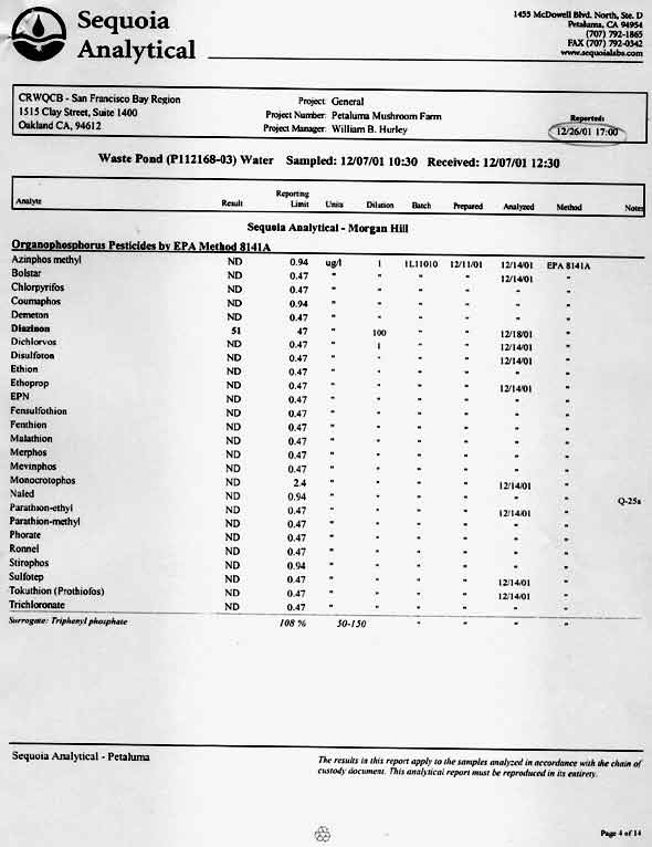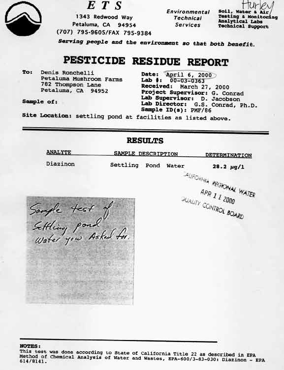 The Mushroom Farm is a heavy user of hazardous materials, with an average of 206 pounds per month being applied during a sample period (1/02-3/02).  This includes Diazinon (158 pounds per month), Pounce (4.35 pounds per month), Mertect (19.69 pounds per month), and Benlate (24.6 pounds per month); an average 2479 pounds (about 1.25 tons) of regulated toxics used per year. These figures are documented in records on file with the Sonoma County Agricultural Commissioner, see:Mushroom Farm's monthly Pesticide Report, Diazinon application, December 1998, page 1,Page 2. Note that 180 pounds of Diazinon were applied during this month. Lab tests of Wastewater Pond from 4/6/00, on file with WQCB, show that the wastewater contains 28.2 ug/l  Diazinon. Lab tests of Wastewater Pond from 12/26/01, on file with WQCB, show that the wastewater contains 51 ppb Diazinon. There has been no testing for the other 3 pesticides used by the Farm.
