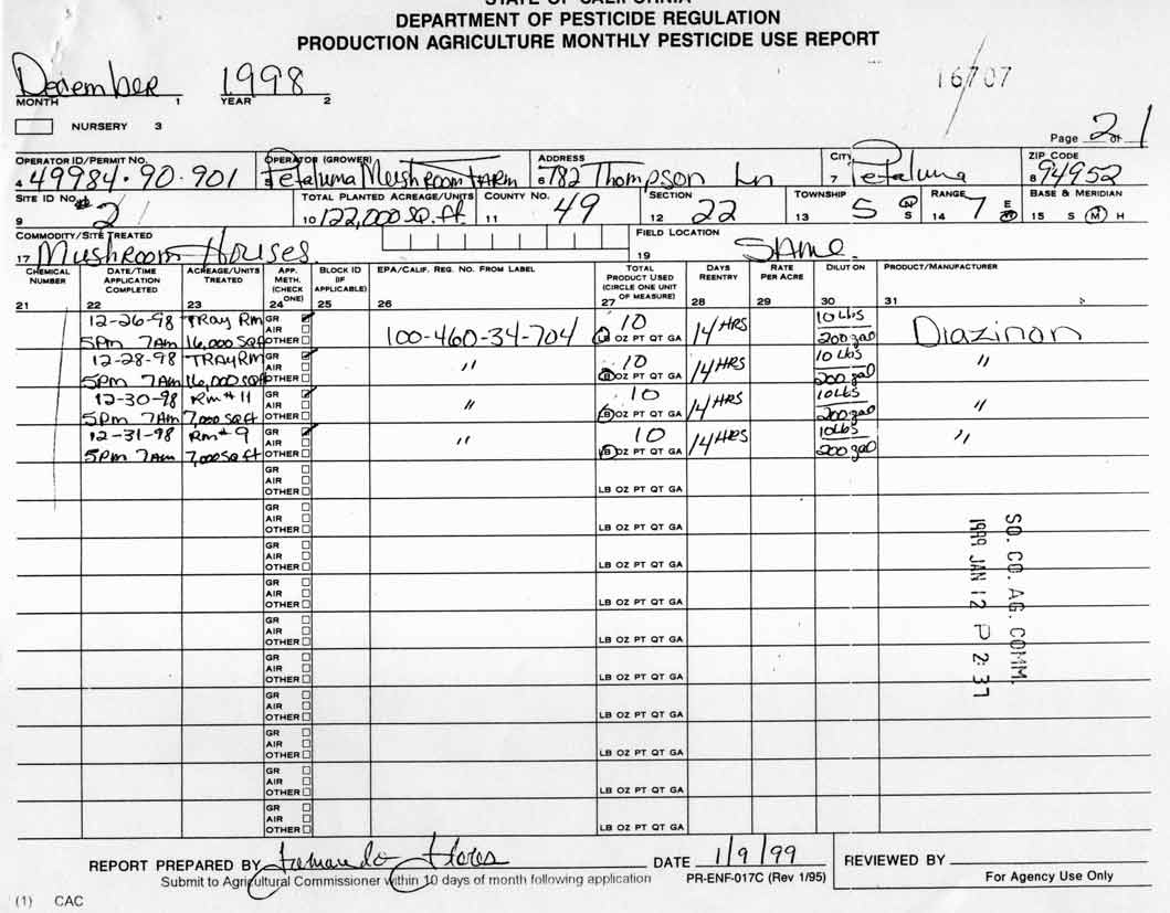 • January 6, 2003: "Compost permit extension denied, Mushroom grower could face fine for delay... A code enforcement official who visited the farm at 782 Thompson Lane on Thursday found piles of compost...They are not in compliance". See Santa Rosa Press Democrat 1/4/03.
