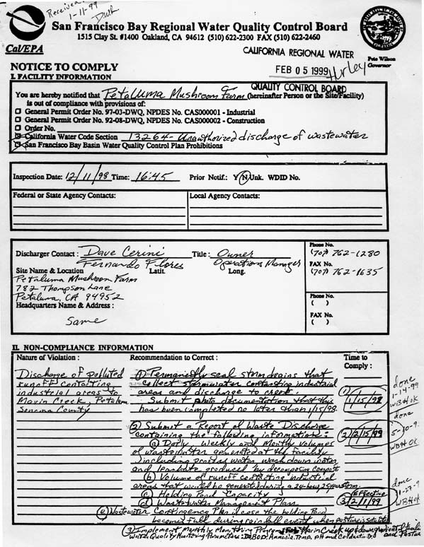 CA Regional Water Quality Control Board 7/27/00 - "We are alarmed by the recurrent nature of the illicit discharges at the Petaluma Mushroom Farm and the facility's apparent disregard for the County and State permit requirements. Illicit discharges and inadequate waste management practices have persisted at the facility despite Regional Board's issuance of a Notice to Comply (January 6, 1999) page 1, page 2 and a Notice of Violation (April 30,1999), the Superior Court's Judgement and Permanent Injunction (September 23, 1999), and the County's determination regarding septic system violations."