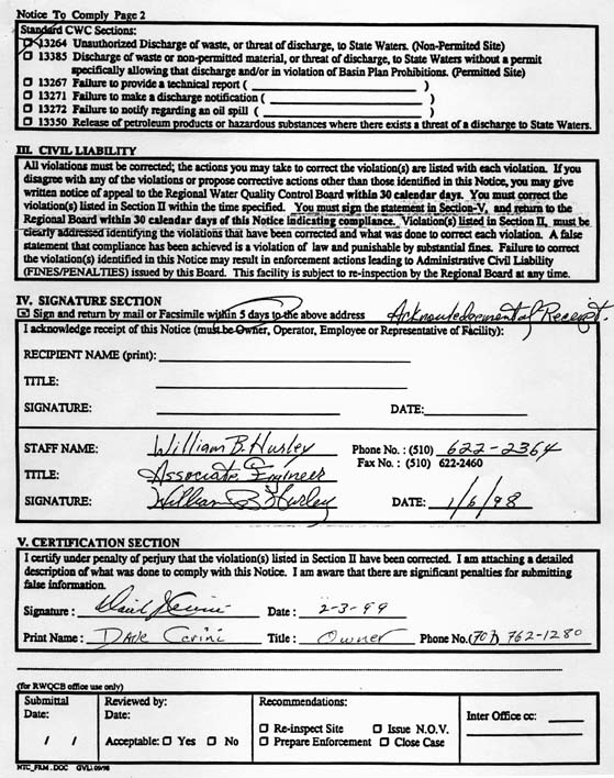 • Envirronmental cleanup, installation of test wells, and monitoring, as required by California Regional Water Quality Control Board are still to be completed. See Cleanup and Abatement Order No. 00-105, subsequent Amendments, and Work Plan.